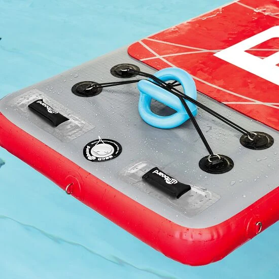 Das Beco „BEboard“ ist eine aufblasbare Matte und bietet Ihnen ein völlig neues Fitnesserlebnis – auf dem Wasser. Das aufblasbare Board ist 250 cm lang und 90 cm breit und bietet aufgrund dieser Größe ausreichend Platz für Yoga, Pilates, Core-TrainingSpezielles Training der Körpermitte: Beansprucht werden hierbei die unteren Bauch-, Rücken- und Beckenmuskeln. Im Gegensatz zum klassischen Rücken- oder Bauchtraining werden die Muskeln nicht isoliert trainiert, sondern im funktionellen Zusammenspiel mit ganzen Muskelketten. Core-Training kann unter anderem Rückenschmerzen reduzieren und Fehlhaltungen ausgleichen. oder Herz-Kreislaufübungen. Mit einer Stärke von 15 cm, dem schichtweisen Aufbau und den Stabilisierungsbändern in der Luftkammer ist die Matte absolut stabil und biegt sich bei den Übungen nicht durch oder verdreht sich. Die Übungsmatte bzw. Trittfläche auf dem Beco „BEboard“ ist aus rutschfestem EVA. Zusätzliche Griffe ermöglichen die Befestigung von Fitnessbändern und erweitern somit die Übungsmöglichkeiten. Unter dem Tool Strapper lassen sich Trainingsgeräte und zusätzliche Ausrüstung sichern. Besonders praktisch: An den Seiten der Floating Matte sind weitere Ösen, sodass das Board am Schwimmbecken oder Ufer befestigt werden kann.