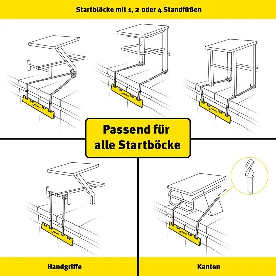 Wer die Finis Backstroke Start Wedge Rückenschwimm-Starthilfe hat, möchte sie nicht mehr hergeben. Die Rückenstarthilfe besteht aus einer beweglichen Edelstahlplatte mit einer thermoplastischen Gummioberfläche und lässt sich mittels Polyesterbändern an jedem Standard-Startblock befestigen. Durch die Querleiste können sich Schwimmer beim Start besser von der Wand abstoßen, ohne mit den Füßen abzurutschen. Zudem bietet sie bei gleichbleibender Kraft einen größeren Schwung beim Start und Sie erreichen schnellere Endzeiten.