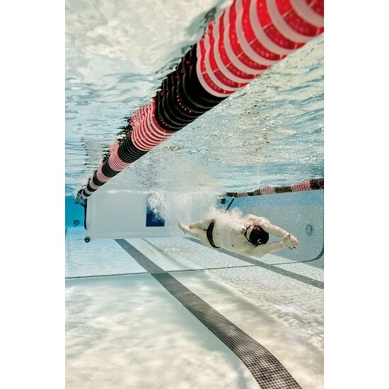 Die Finis Turnmaster Pro Swim Wall besteht aus chlorresistentem FiberglasSynonym für Glasfaserverstärkten Kunststoff (GFK): Ein hochwertiger Faser-Kunststoffverbund. Eigenschaften sind u.a. eine hohe Bruchdehnung und eine sehr elastische Energieaufnahme. Einsatz: u.a. Bootsbau, Fahrzeugbau, Spielplatzrutschen. und hat einen stromlinienförmigen Aufbau, welcher den Wasserwiderstand verhindert. Der Aufbau der Wand ist einfach: Mittels 2 Personen wird sie in der Mitte zwischen 2 Schwimmleinen eingehängt. Auf diese Weise ist das Training von beiden Seiten möglich und 2 Schwimmer können gleichzeitig trainieren. Gleichzeitig verkürzt sich die Schwimmbahn, was ideal für das Training von Sprints ist. Nach dem Training lässt sich die Finis Turnmaster Pro Swim Wall dank integrierter Räder ganz einfach wegfahren und lagern.